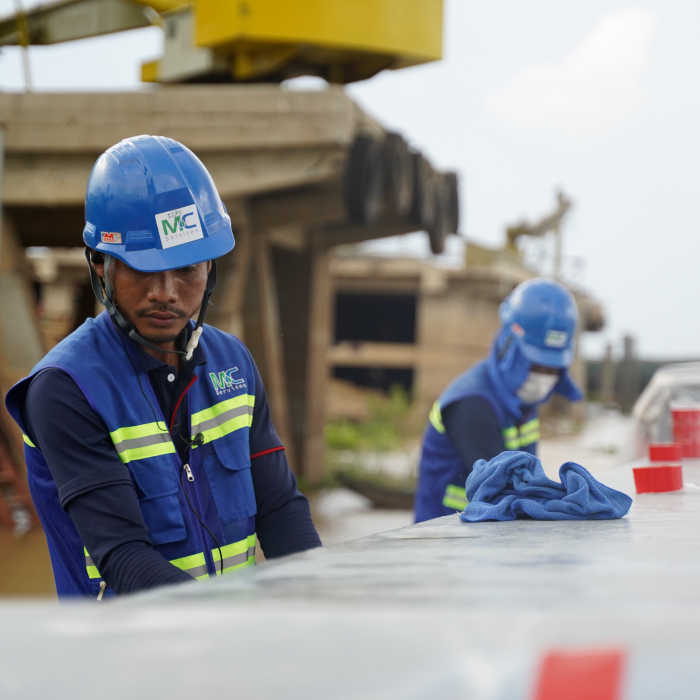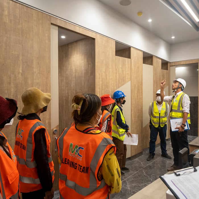 សកម្មភាពក្រុមការងារ MC Services ប្រជុំណែនាំពីសុវត្ថិភាព និងការរៀបចំខ្លួនមុនប្រតិបត្តិការការងារសម្អាតលម្អិតជូនក្រុមហ៊ុន ហនុមាន។